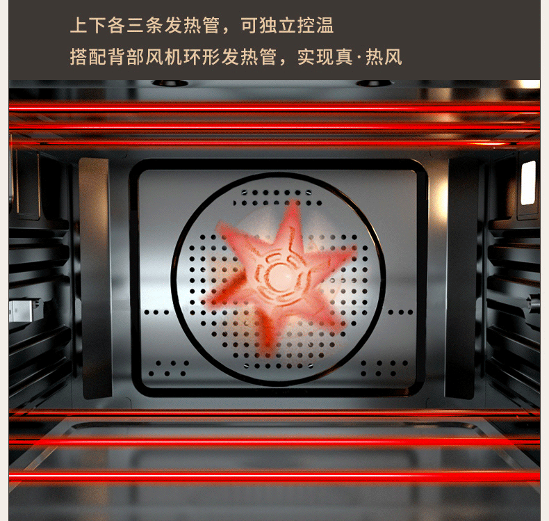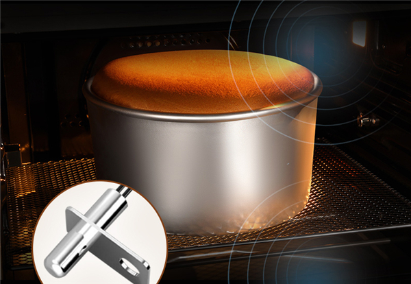 搭配背部硕大风机环形发热管,通过风机带动热空气整体流动起来,并且风机是正反转电机,可以加快升温, 而且受热相比单独加热管更加均匀,降低能耗。风机关闭状态下,上下加热管作用于食材,变身成烤箱。双NTC感温探头,能够精准控温,美味不翻车。