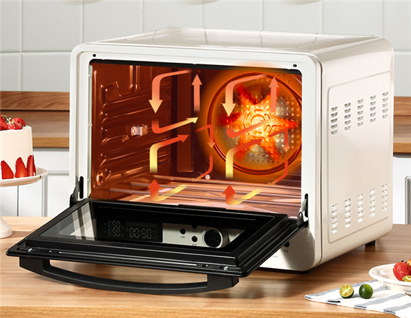 ACA风炉烤箱A8容量40L,奶白色烤箱机身+大面积加厚双层黑色玻璃门的经典配色,更容易融进不同装修风格的厨房、餐厅,摆在家居或门店的任何角落都是一道亮丽的风景,同时还可以透过玻璃随时观察食品加热状态。机身多面设计有散热百叶窗,散热效果好。