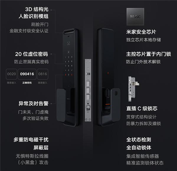 小米人脸识别智能门锁覆盖身高范围 1.3-2m,建议识别距离 0.3-1m,最大支持录入 50 人的人脸数据。同时,该智能门锁采用直插 C 级锁芯,配备多重防电磁干扰屏蔽层,无惧特斯拉线圈(小黑盒)攻击。