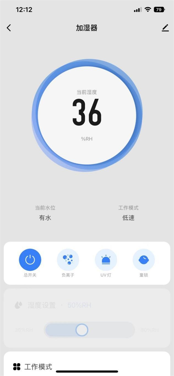 控制加湿器的方式有两种,分别是通过最上放上的三枚按键进行控制,或者是通过手机下载「airx智能」App。我个人还是更喜欢通过手机端进行远程控制。在这里你可以可以远程查看加湿器的工作状态,还可以进行开关加湿器、调节风速、开关负离子、UV灯、童锁、灯光、声音等设置,十分方便。下班时可以远程开启加湿器到最大风量,这样我进家门时就可以达到适宜的湿度;晚上睡觉前想调小风量,不用再下床走过去按键,直接用手机搞定。