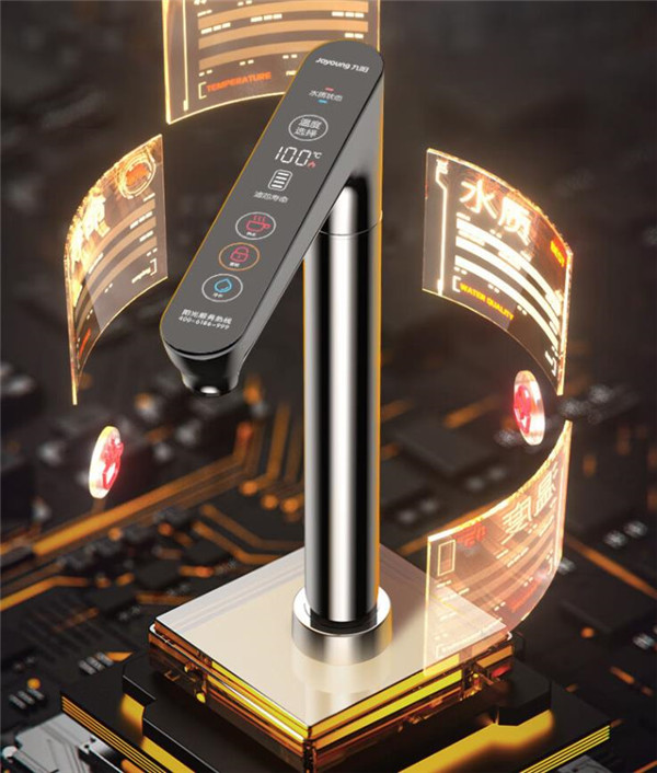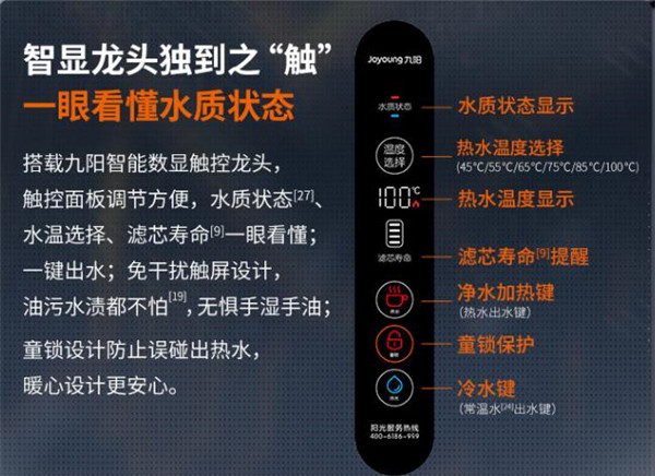 九阳热小净二代搭配的这款智能控温水龙头,除温度选择、滤芯寿命、热水、童锁、冷水几个按键外,还新增了一个水质状态的显示,这也是二代与一代的一个不同之处。