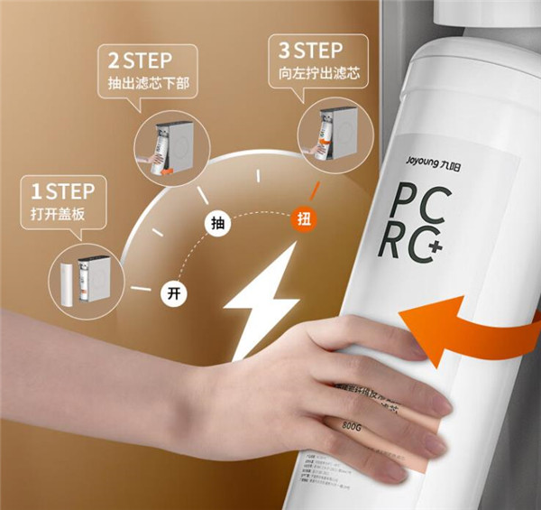 这颗滤芯是五合一的组合滤芯,九阳直接将初滤、RO膜、活性炭等结构整合为一,给用户带来了这颗五合一PCRC+复合滤芯。它”麻雀虽小,五脏俱全“,高度集成了各种过滤技术,既可以对大颗粒泥沙、铁锈、细微杂质等进行初滤,又能通过特制的航天V型膜对水质里的细菌等进行有效过滤,配合末端改善口感的活性炭结构,可以带来更好的净水效果。