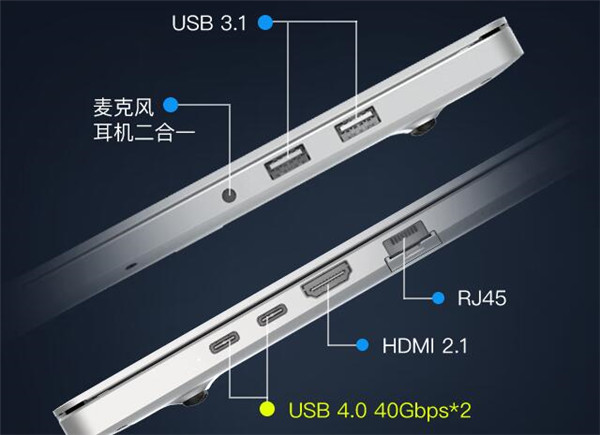 接口方面,这款机器也是充分考虑到了目标用户群体的使用需求,首先在机身左侧,配有2个传输速度达到40Gbps的USB4 Type-C接口,兼顾电源口的同时,还可以提供高速数据传输能力。另外左侧还配置了1个标准的HDMI 2.1接口和1个RJ45网口。