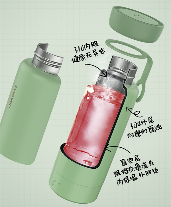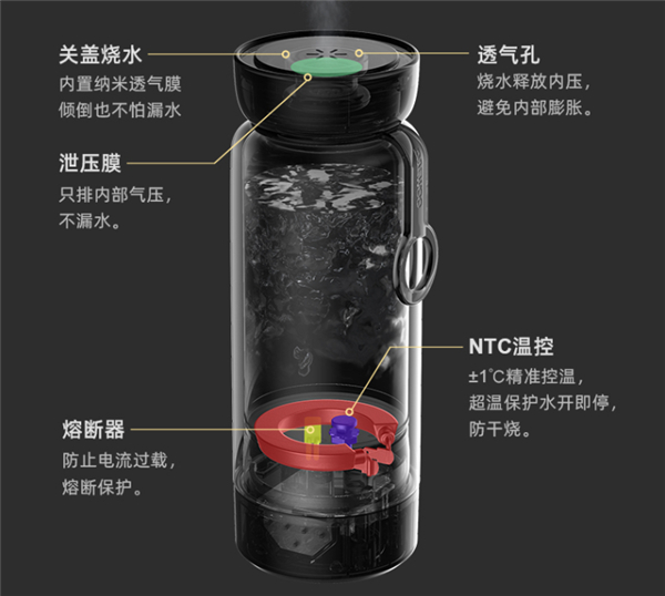 大宇彩虹便携烧水杯搭载了NTC精准控温,超温保护水开即停,有效做到防干烧的安全,同时12小时固定恒温,就算是久放也不会凉,当然大家也无需担忧烧水会不会吵到别人,其35dB安静烧水模式,紧凑办公不打扰。
