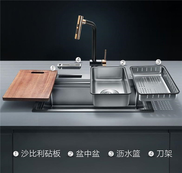 双阶梯结构是砧板和另外两个水盆位于不同高度放置可以做到互不干扰,进一步节约了台面空间,同时这一趟也可以让这个庞大的单槽变身双槽,可以根据自己的需求进行搭配使用。