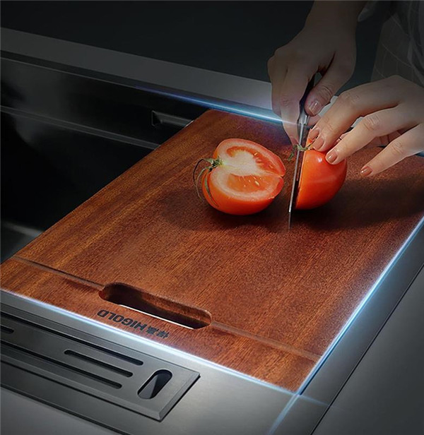 砧板在水槽中的稳定性也不错,在冲洗砧板的时候也无需担心水流漫上台面,下沉式设计可以轻松将水流统统排放至水槽内。