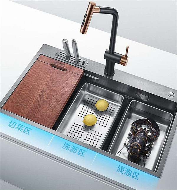 总结,悍高双阶梯多功能纳米水槽采用双阶梯错位设计,可以在上面进行洗、切、沥,超级的方便,而且下水快。