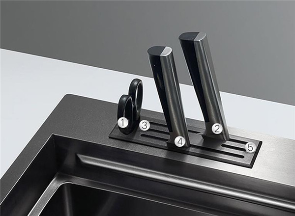 刀架的开口可以放置5把刀具,常规的套刀基本也就是五件套了,这样又省下了一个刀架,同时切菜时取放也更加简单,刀架下方的集水槽则可以避免刀具上的水滴侵蚀下方的柜体。