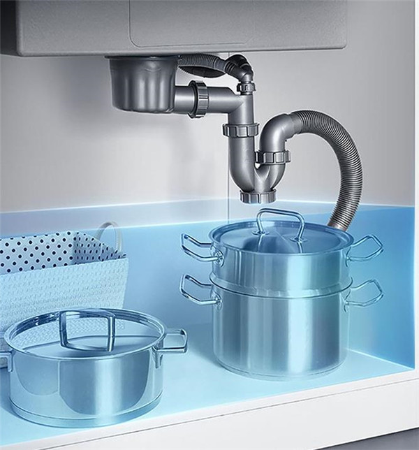 下水系统为后置式,这样可以将槽下柜体空间占用降低。其中下水管自带了尾管塞,有效隔离异味以及不明昆虫的搅扰。弯管底部也留有防堵塞,当残渣堵住下水管的时候可以很方便的进行清理。