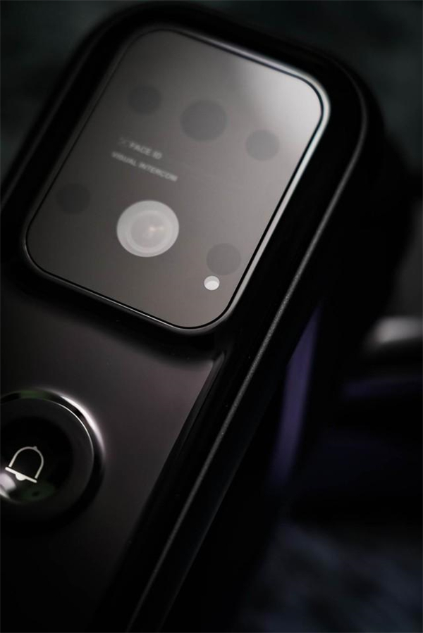 室外锁体从上到下依次为红外人脸识别摄像头、门铃、密码输入区、NFC识别区、钥匙解锁区和紧急充电口。值得一提的是,指纹解锁的模块设计在了门上把手的内侧,用户伸手指纹解锁时就能顺势把门拉开(推开),无需旋转既能完成开门。