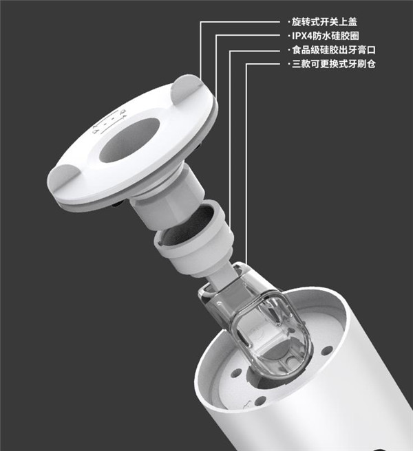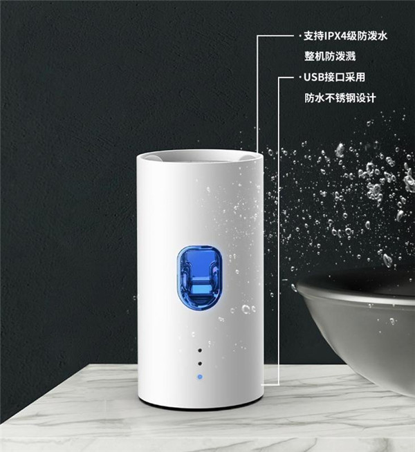 小猬智能牙膏机支持IPX4防水等级,能够适用于潮湿环境下使用,就算是生活泼溅水也不会对这款产品造成影响,在产品的顶部是放置牙膏的区域,盖子是可以拧转下来,可以对中间食品级的硅胶接口进行清洁,USB充电接口采用防水不锈钢设计。