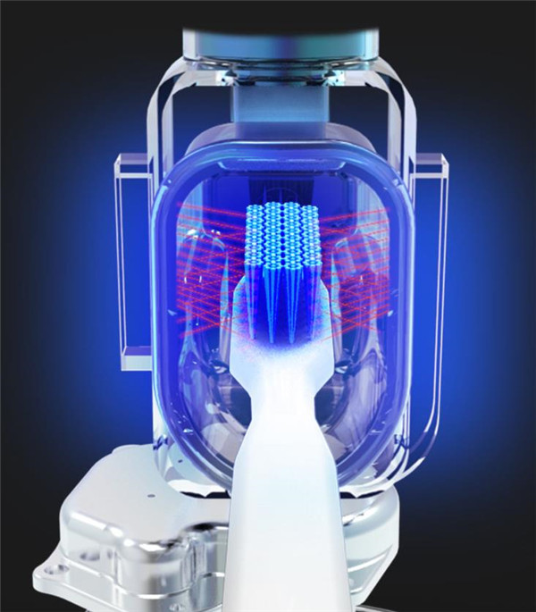 小猬智能牙膏机在开机的状态下,待机工作时是没有任何灯光亮起的。将牙刷平稳放入牙刷仓之后,UV紫外杀菌仓的蓝色灯光就会亮起,牙刷和牙膏同步进行杀菌操作。工作状态指示灯也会亮起,提示用户当前主机工作的档位。
