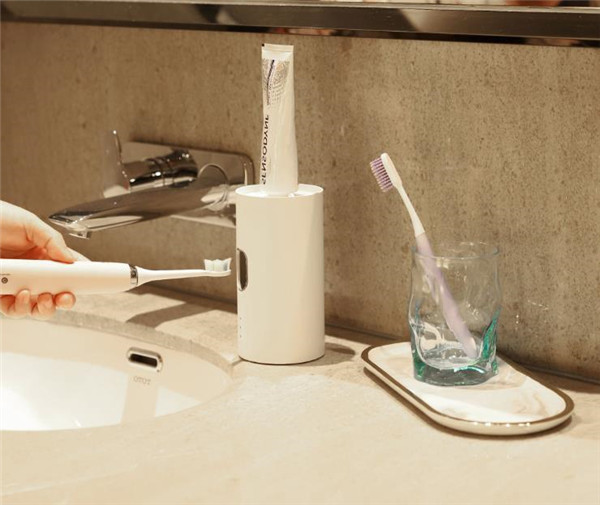 小猬智能牙膏机放置在沥水置物架上节省了平板空间,因为正常使用环境下除了潮湿之外,还难免会有一些泼溅水渍,置物架沥水的设计就变的非常重要,主机底部的脚垫也起到很好辅助沥水的作用,置物架和主机的颜色还是蛮搭配的。