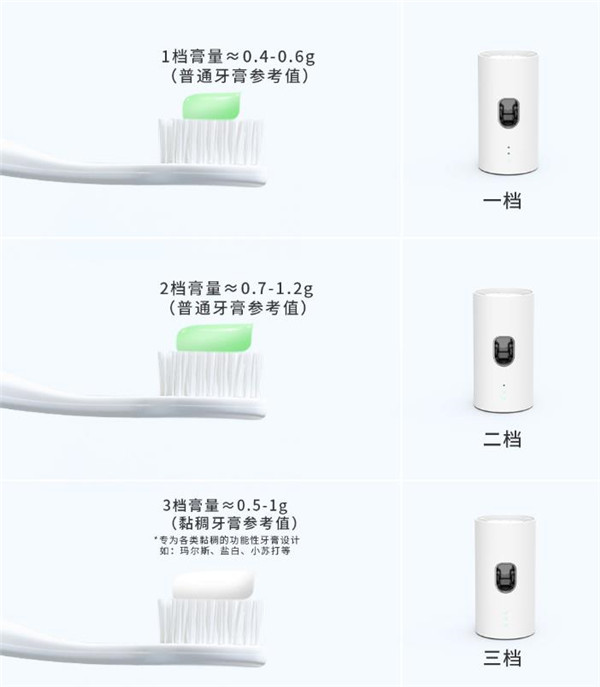 小猬智能牙膏机因为氛围三个档位挤出牙膏,得益于全铜芯高速电机、10000转高速马达的配合,利用高倍速变速箱的工作模式让不同粘稠度的牙膏顺利挤出,工作的时候噪音很低,一档寄出来的牙膏基本够用,二档挤出来的牙膏是一档的两倍。