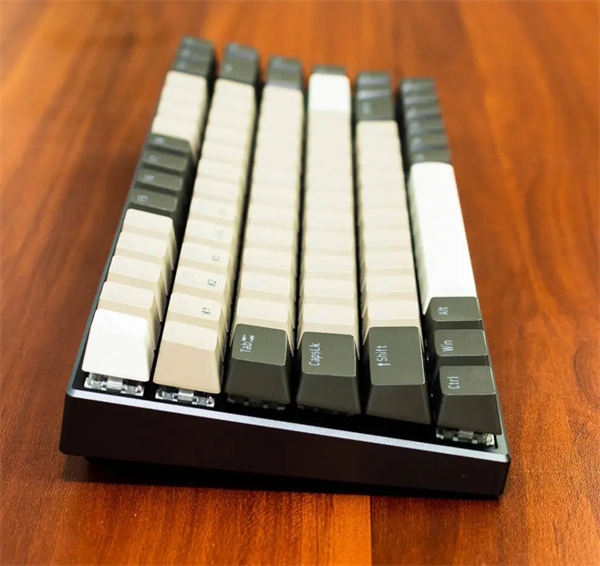 雷柏V700-8A机械键盘呈现一定角度倾斜,这样让按键具有层次感。左右两侧没有其他设计。从侧面看,可以非常明显地看出其悬浮式的按键。这样的设计比较耐脏,抗粉尘和污染的效果,会更好一些。