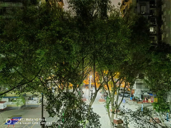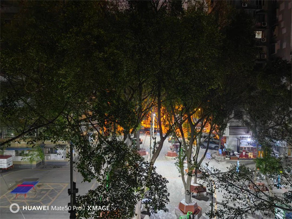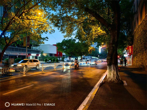 例如上述部分,注意看,这部分是黄色灯光在地面上的延伸,华为Mate50 Pro把路灯光线的色彩和明暗过渡做得非常细腻,也没有跟后面的白色灯光“糊”在一起,XMAGE的算法对色彩、光线的把控到位,我不认为用几行代码或是公版算法就能实现的效果。可见2年间,华为在新算法上做了很大的努力和付出。