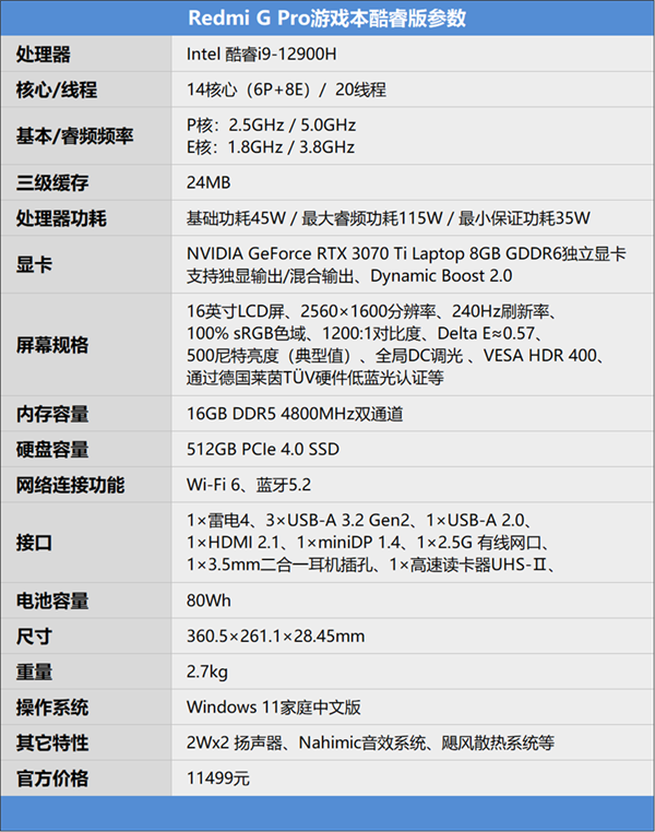 汇总来看,Redmi G Pro游戏本酷睿版搭载的i9-12900H,表现轻松超过上一代i9-11900H自然点毫无悬念,比起竞品的锐龙9 6900HS也要更加出色。