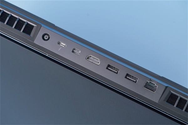 接口主要都放在机身后部,从左到右依次为:电源接口、雷电4、mini DP1.4、HDMI 2.1、两个USB-A 3.2 Gen2、2.5Gbps有线网口。