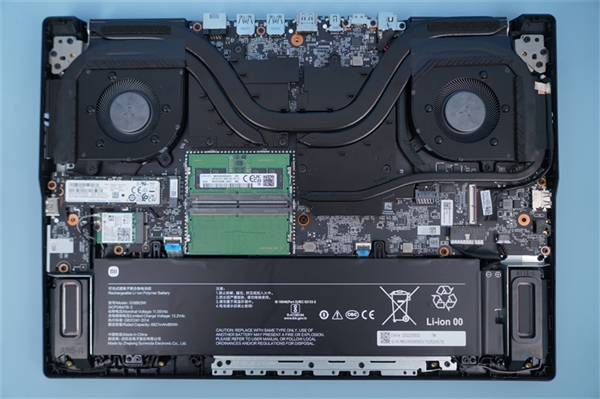 内存左边的SSD,型号为三星PM9A1.容量为512GB,是当前最主流的SSD,下面则是M.2无线网卡。比较遗憾的是只有一条NVMe M.2 SSD插槽。