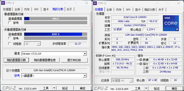 在CPU-Z分数测试中,12900H单线程得分800.多线程得分8297.5.