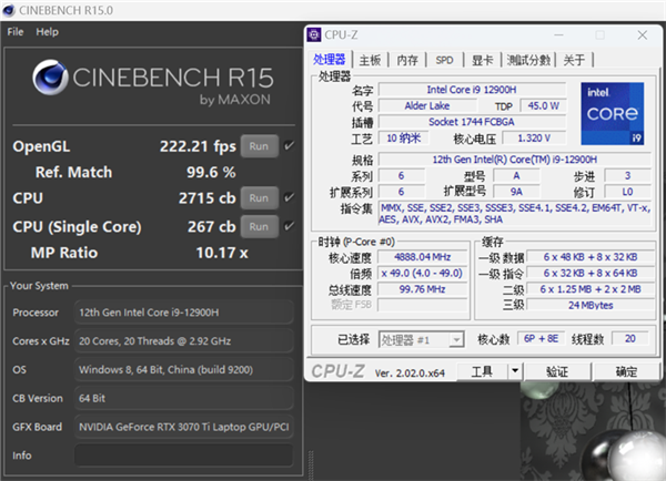 在CineBench R15测试中,12900H单线程成绩为267.多线程为2715.