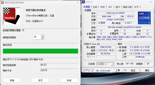 国际象棋最大只支持16线程,12900H跑出了相对性能倍数66.83.每秒32078千步。