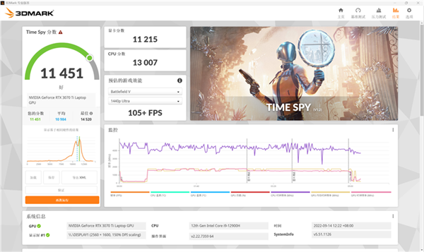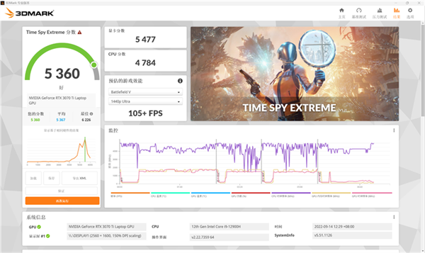 在Time Spy Extreme(4K分辨率渲染)总得分为5360.其中RTX 3070 Ti Laptop的图形分数为5477.12900H分数为4784.