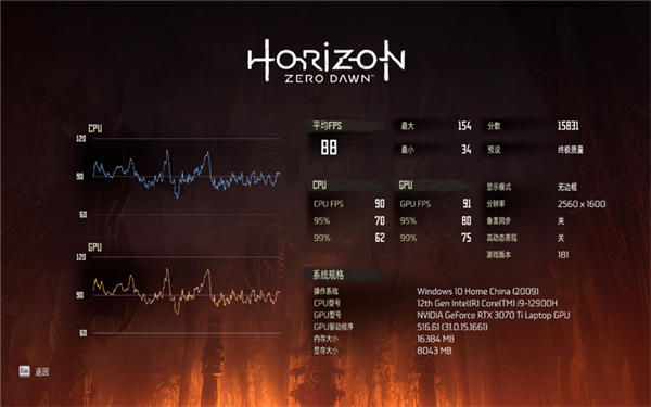 《地平线:零之曙光》在2.5K分辨率+终极质量画质下,平均帧率为88 FPS。