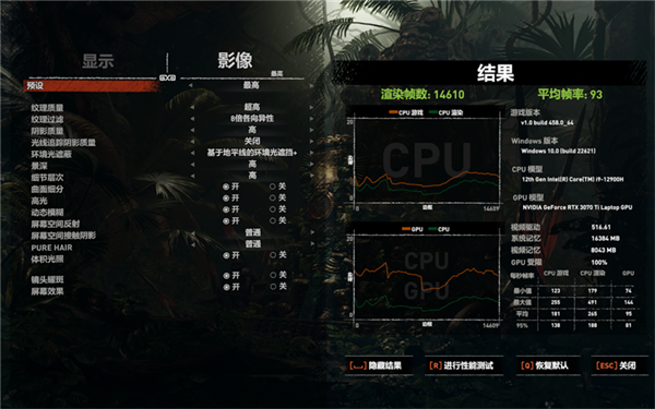 《古墓丽影:暗影》在2.5K分辨率+最高质量画质下,平均帧率为93 FPS。