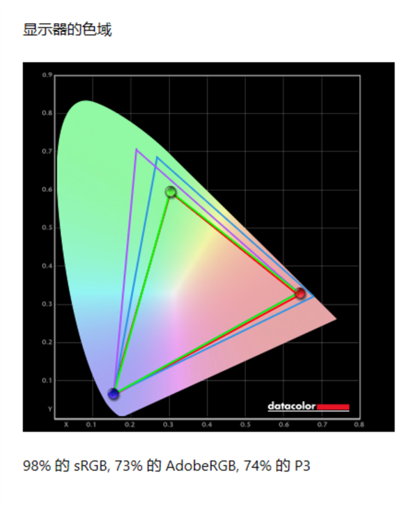 Redmi G Pro游戏本酷睿版的屏幕覆盖了98%的sRGB色域、73%的Adobe RGB色域、74%的P3色域,比较出色的表现。