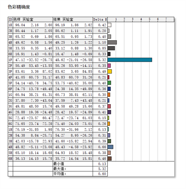 在色彩精准度上,实测Delta-E最大值为5.32.最低值为0.13.平均为0.6.