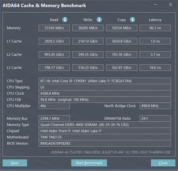 在AIDA64进行内存缓存测试,测得的读取、写入、复制带宽分别为57249MB/s、58285MB/s、50554MB/s,延迟为96.3ns。