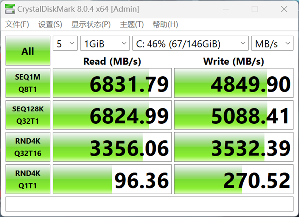 使用CrystalDiskMark测得PCIe 4.0 SSD,在连续速度上,读取6832MB/s,写入4850MB/s;4K随机速度上,读取96 MB/s,写入271MB/s。