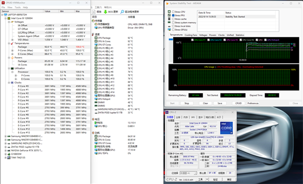 烤机10分钟后,此时12900H功耗稳定在85W左右,CPU核心电压在1.049V,温度在92摄氏度左右浮动,P核频率在3.9GHz,E核频率在2.8GHz。