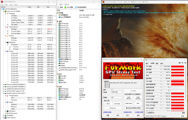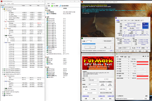 我们在使用FurMark为RTX 3080 Ti Laptop烤机的基础上,增加CPU burner项目,进行CPU+GPU双烤。