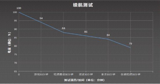 在实际的续航测试中,我们模拟了日常使用中常见的几个使用场景,包括30分钟“王者荣耀”、30分钟视频通话、30分钟阅读、30分钟听音乐和30分钟在线视频,共计150分钟的连续续航测试。测试结束后剩余电量高达79%,据此推算,该机基本可以满足在线游戏6小时,在线观看视频7小时,在线阅读约20小时,连续视频通话6小时,对于一款如此轻薄的手机而言,这样的续航表现已经十分惊喜了。