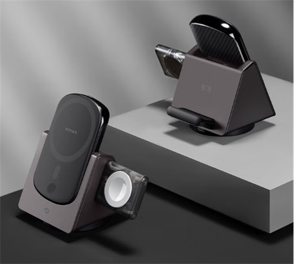 PITAKA 三合一磁吸充不仅能同时为三个设备无线充电,而且体积小巧、有治愈的旋转阻尼声、可扩展移动磁吸背板(可带走化身充电宝)。