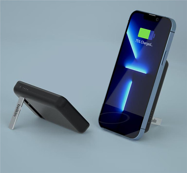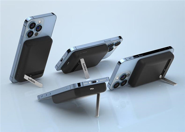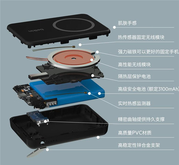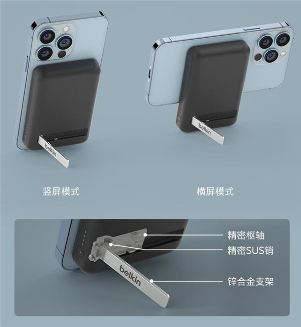 贝尔金磁吸无线充电宝设计了一个可以收起来的支架,由精密枢轴、精密SUS销和锌合金支架组成。当手机和充电宝结合的时候,这个支架可以作为手机支架,四个方向均可支撑,为手机进行支撑,让你使用手机的更加方便。