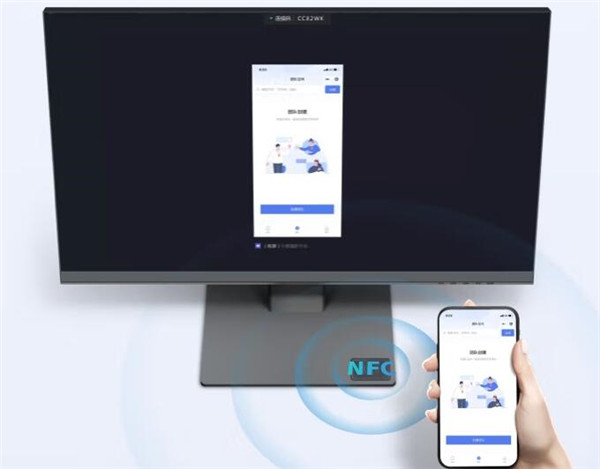 MAXHUB 27寸智能显示器显示器底座内置有NFC芯片,使用搭载NFC功能的手机触碰此区域就能快速配对。后续连接时无需再次配备,轻触一下,小屏瞬间变大屏。