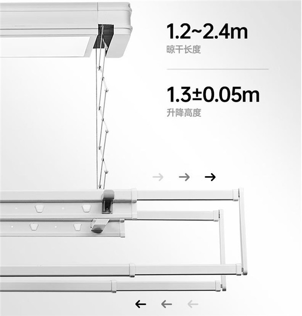 凯迪仕T22电动晾衣架不仅仅可以上下伸缩,还可以左右伸缩。晾杆延伸可达2.4 m,可以满足不同的晾衣需求和空间大小。我们将晾衣架全部打开,晾杆长度是1.2~2.4m,升降高度是1.3+0.05m。伸出的晾衣杆质量也是非常好,超结实,伸出过程同样也没有异响和任何卡顿。