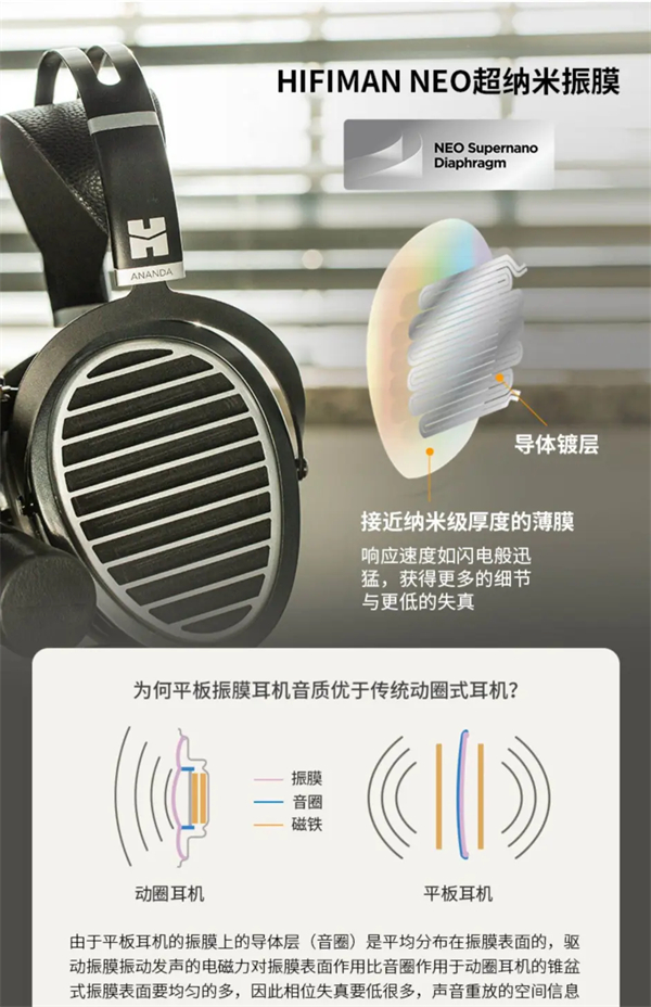NEO超纳米振膜是非常重要的,我们的双耳能够听见声音一方面是空气的传导,另外一方面就是物体的振动,耳机振动就跟振膜有关,而振膜质量的好坏对音质起到了至关重要的作用。NEO超纳米振膜采用了更加轻薄的设计,在传递声音和振动频率上会更快,并且声音的细节也更加丰富,得益于HIFIMAN平板振膜的优势,它的频响范围更加宽广、声场更大、失真更低,比动圈耳机更加保真,声音的播放也更加自然。