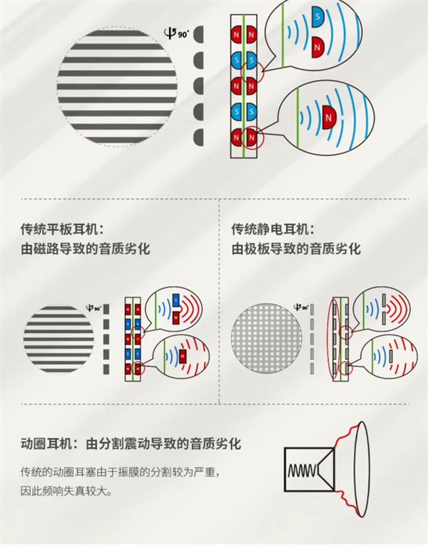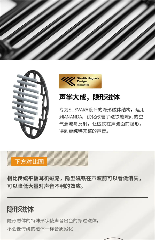 另外一点就是隐形磁体,声音通过空气传播时会存在损失,在穿过磁体时声音就会发生劣化,在双耳听到时就会感觉声音不是很好听。而HIFIMAN通过多年的技术积累和对声音的研究,通过改变磁体的形状设计,空气穿过磁体时声音损失更低,达到"声波在穿过磁体时仿佛隐形了",改善了声音的失真情况,从而提升了音质,我觉得声音更好听一点,技术就往前迈进了一大步。