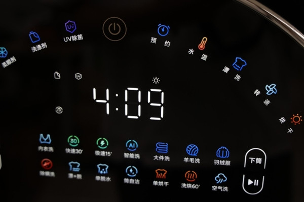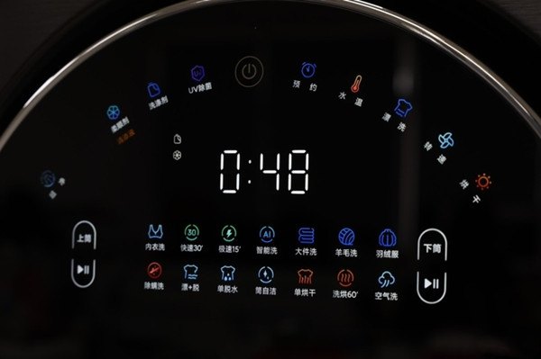它的控制逻辑同样十分清晰易懂:待机时整体息屏,与刚钻玻璃材质筒门融为一体,长按电源图标即可开机显示。电源图标左侧可以进行三类洗衣剂投放控制以及超净、UV除菌两种功能控制,右侧则是预约、水温、漂洗(次数)、(脱水)转速、烘干几种常规的洗衣程序调节。“魔镜全息”界面中部是主要的状态显示区域,包括功能启用状态与预计剩余时间。下部呈两排布局的则是各式预设洗衣程序,以及左右两端的上下筒独立控制,上筒或下筒图标闪烁时,说明用户正在进行该区域的程序设置。