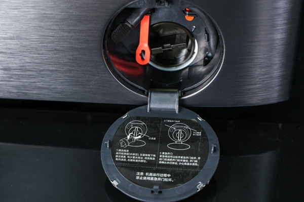 来到机身正面右下方可以看到过滤器盖,按动即可向下弹出,可用于清洁内部拦截的污渍,此外还有两处橙色的拉环,左右分别可用于上下门应急开门。
