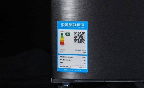 机身表面的其他细节方面,创维S15H分别在正面的左下角与右上角贴有两处标签,左下角为家电必备的中国能效标识,显示这款双驱分舱洗衣机整体达到了一级能效,耗电量、用水量分别为1.19千瓦时/工作周期和97升/工作周期,总洗涤/脱水容量为15公斤,洗净比达到1.10,为滚筒洗衣机产品中的优秀水平。