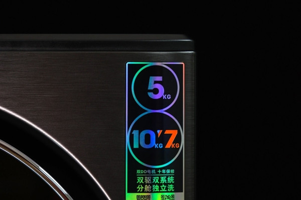 右上角的标签则注明了上下滚筒具体的容量配置,以及一部分功能特性。正如前文提到的,创维S15H的上筒拥有5公斤洗脱容量,下筒拥有10公斤洗脱容量和7公斤烘干容量,此外双滚筒均采用变频直驱电机,电机享受十年保修服务。