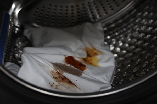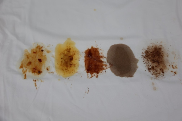 这项测试中,我们使用五种清洁难度不一的调味料等液体作为目标污渍,分区域涂抹于洁净的白色T恤上,从左至右分别是:辣椒酱、沙茶酱、烤肉酱、酱油、可可粉冲调液体。