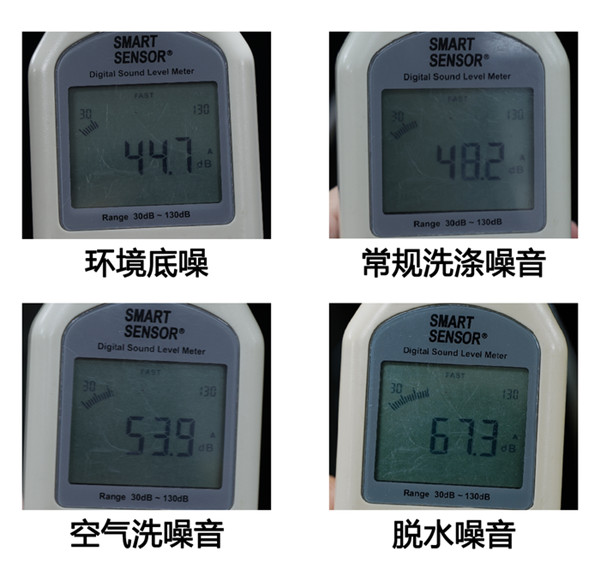 滚筒高速旋转的脱水状态下,测得噪音约67dB,同样优于国家标准72dB。