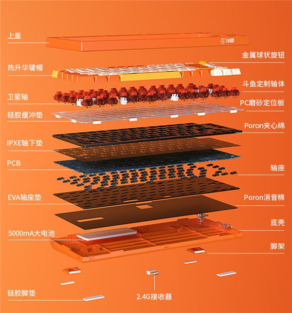 轴体方面,用的是斗鱼定制的红轴,标准的5脚热插拔基座,可以兼容市面上基本所有的3脚/5脚热插拔轴。