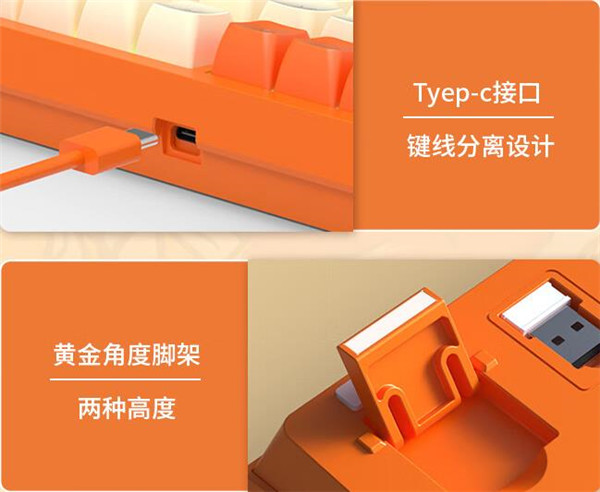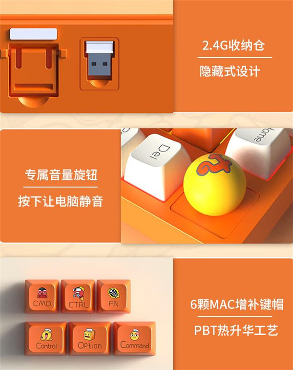 斗鱼DKW500无线三模机械键盘在配色方面,非常的靓眼,采用了斗鱼经典的橙白配色,辅以少量的黄和黑,就算是不亮灯也很好看了,配件方面,给了6个Mac增补键、橡胶线、双头的拔键器和拔轴器和说明书。